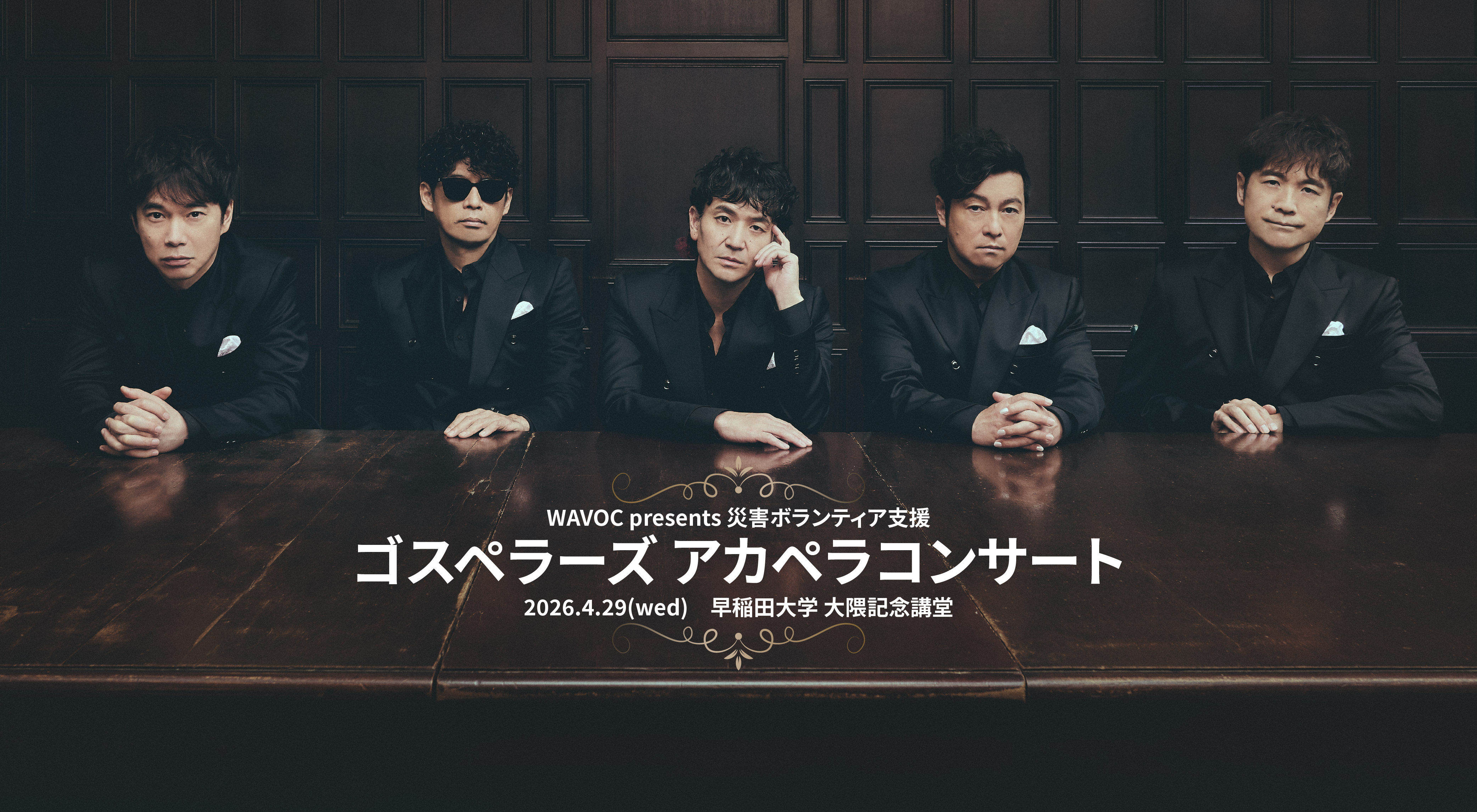 「WAVOC presents 災害ボランティア支援 ゴスペラーズ アカペラコンサート」は、2011年に発生した東日本大震災をきっかけに、毎年ゴスペラーズを中心に開催しているアカペラコンサートで、公演利益全額を早稲田大学ボランティア団体「早稲田大学 平山郁夫記念ボランティアセンター(WAVOC)」の活動支援として毎年寄付させていただいております。