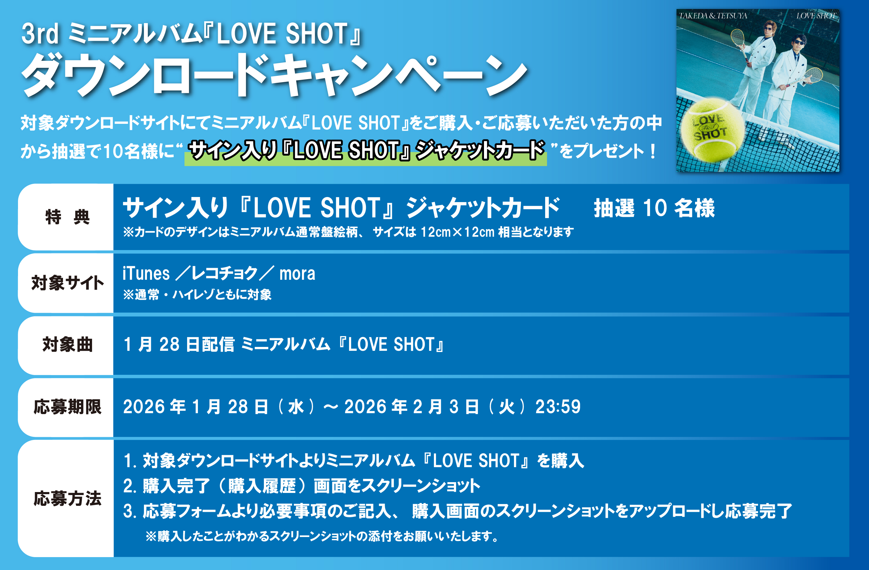 武田と哲也、3rdミニアルバム『LOVE SHOT』ダウンロードキャンペーン開始!